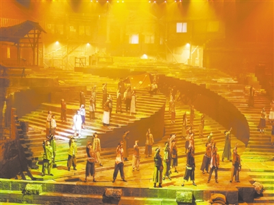 吊脚楼、长石梯、老牌坊、纤夫拉着木船、码头人来人往……随着灯光亮起,曾经让人熟悉的老重庆出现在观众面前。随着音乐变换、舞台转动,观众座位也随之旋转,凭借高科技的舞台表现手法,观众们仿佛又穿越回“黎明”前的山城,重温那段满含悲壮而又令人肃然起敬的历史。