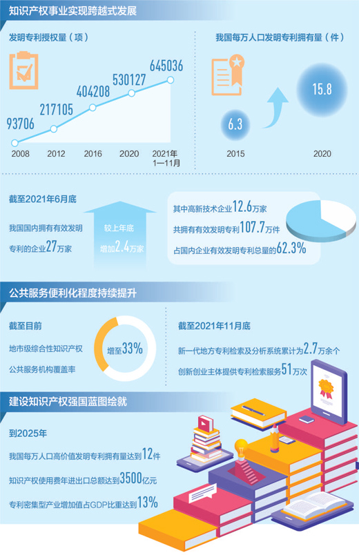 随着创新驱动发展战略深入实施,我国知识产权事业加快发展。“十三五”期间,我国每万人口发明专利拥有量提前达到预期值,PCT(专利合作条约体系)国际专利申请量2019年跃居全球第一。2021年前三季度,我国知识产权使用费进出口额接近2800亿元,其中,出口额增长迅速,增幅超过27%。知识产权综合实力大幅提升,有力支撑了创新型国家建设。