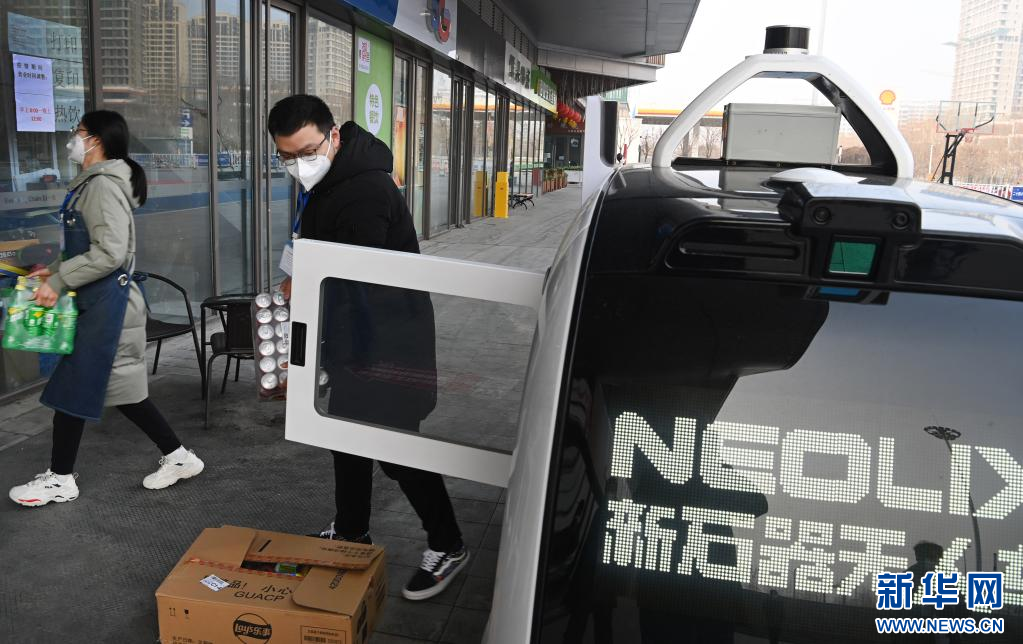 1月9日,无人配送车到达目的地,便利店主人在接收货品。