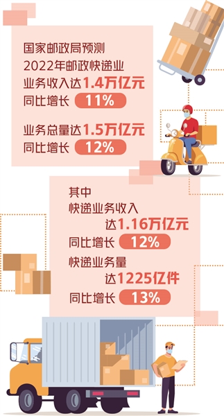 值得关注的是,邮政快递业既贯通生产、分配、流通、消费各环节,又关联一二三产业,具有“畅通”功能,仍处在重要战略机遇期。据国家邮政局预测,2022年全行业业务收入完成1.4万亿元,同比增长11%左右;行业业务总量完成1.5万亿元,同比增长12%左右。其中,快递业务收入完成1.16万亿元,同比增长12%左右;快递业务量完成1225亿件,同比增长13%左右。