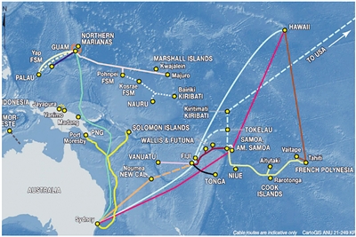 截至2021年5月,太平洋地区的海底互联网电缆路线图。