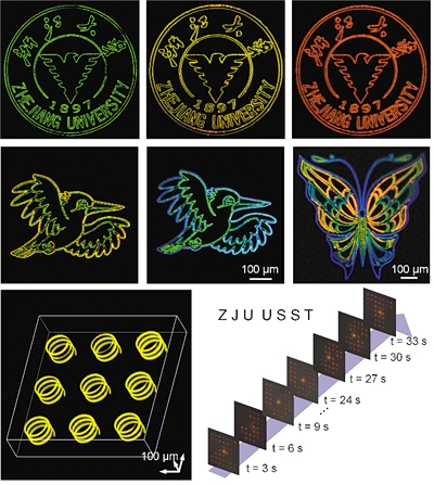 为了进一步展示该技术的特点,研究团队在微米级精度内实现了应用于多维信息编码和防伪的钙钛矿纳米晶彩色图案化,以及在一块Cl—Br—I共掺杂玻璃内部的全彩色发光图案和3D微螺旋直写以及三维全息显示。