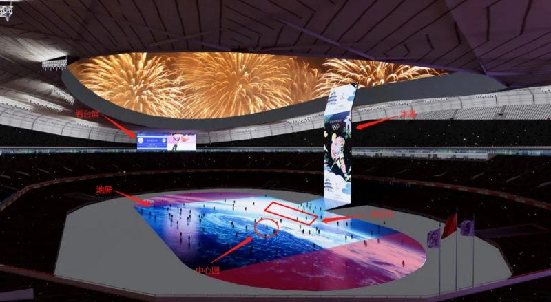地面显示系统作为开幕式演出显示系统和表演舞台,承载了开幕式60%以上的演出创意,是目前世界最大的LED三维立体舞台,像素达到14880x7248,接近8个8K分辨率,完美呈现裸眼3D效果。
