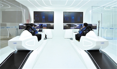 ▲在沧州云图科技有限公司的“5G云代驾”驾驶舱内,工作人员在进行5G平行驾驶测试。