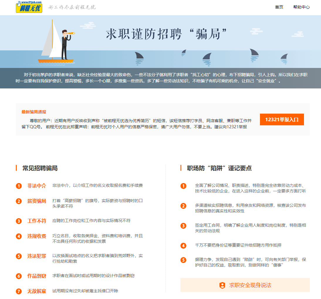 针对涉嫌违法违规的职业和招聘类型常出现在城市服务业、制造业等蓝领求职招聘市场的现象,《简报》提及,前程无忧自2020年以来持续开展违规中介专项整治,对涉嫌违法违规虚假职位进行招聘前置的预警提示及线下核验,并主动向当地劳动检查部门进行举报和证据检举。
