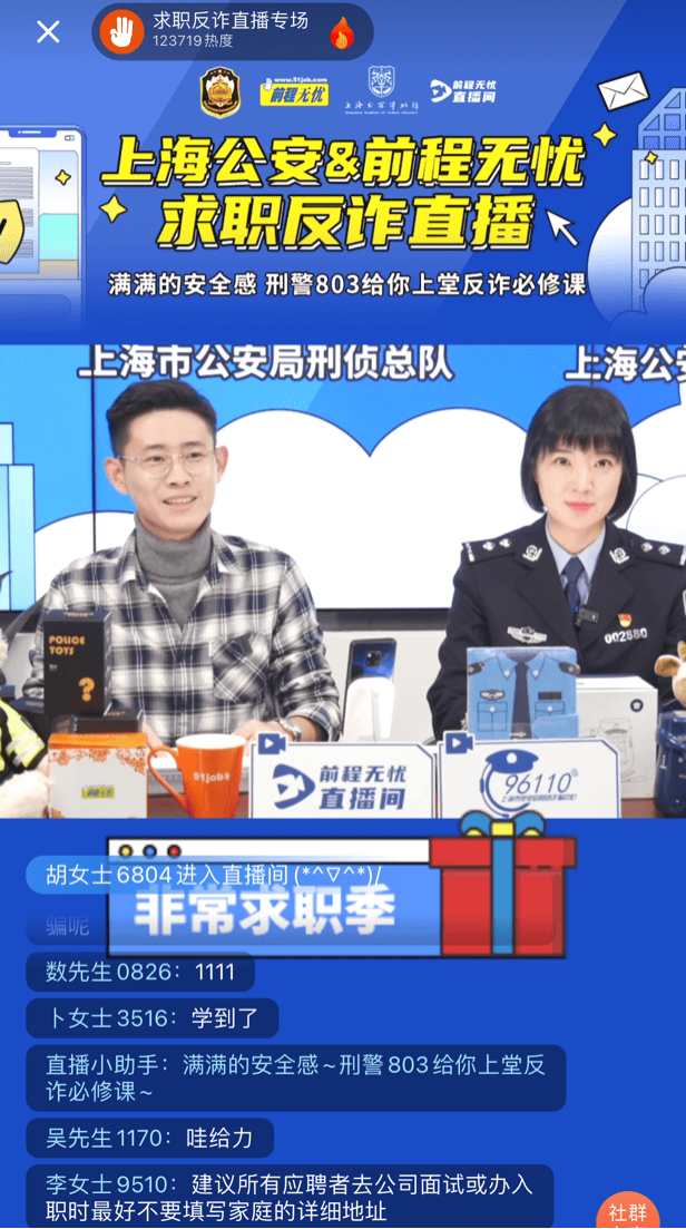 除以上个人信息和隐私保护措施外,前程无忧还积极开展个人信息保护安全教育,针对特定人群推送“求职安全小课堂”,覆盖数十万求职者用户。携手上海反电信网络诈骗中心、上海公安局刑侦总队、上海公安博物馆线上开讲,针对从求职到入职过程中可能遇到的主要诈骗行为,结合真实案例,为超过4万名求职者在线预警解答。