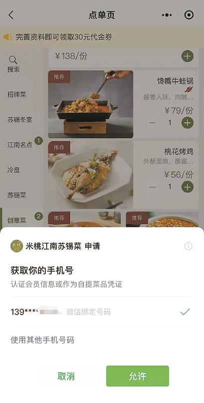 不过,记者留意到,即便不强制消费者关注公众号,但用各种环节套取消费者信息的情况仍存在。在北外滩来福士的米桃江南苏锡菜餐厅,记者用手机扫桌上的点餐码,立刻跳出了“储值1000送100”的提示。记者并不想充值,可如果不翻过这个广告,就没法点餐,且页面上只有一个“点我授权”的选项。不得已,记者只能点了“点我授权”,结果就被要求提供微信昵称、头像。还好,这个环节有“拒绝”选项,记者选择“拒绝”后,发现也能进入点餐页面,并完成点餐。但奇怪的是,在结账页面,该小程序又申请获取点餐人的手机号码,如果取消,就不能结账。也就是说,从点餐到结账,这个小程序总共3次索取消费者个人信息,且最后仍成功获取了手机号码。