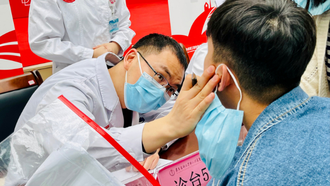 图:义诊活动专家在给患者检查