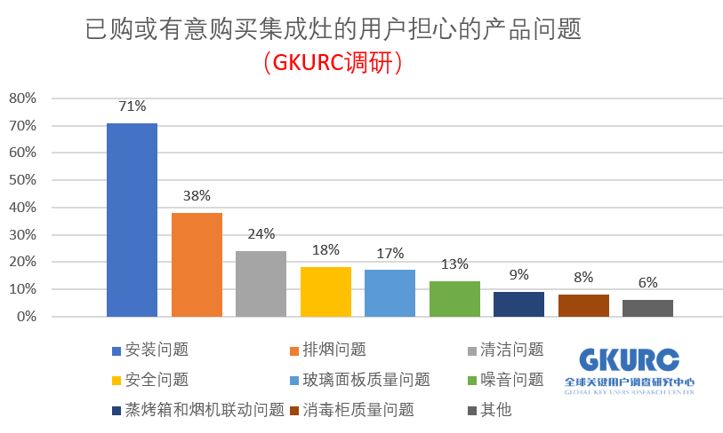 千趣GKURC调研数据显示(调研问题为多选),在1231位已购买或者有意愿购买集成灶的消费者中,担心安装问题的用户最多,占比71%;担心排烟问题、清洗问题的用户分列二三位,分别为38%、24%。另外,担心安全问题、玻璃面板质量问题、噪音问题、蒸烤箱和烟机联动问题、消毒柜质量问题的用户,分别有18%、17%、13%、9%、8%。