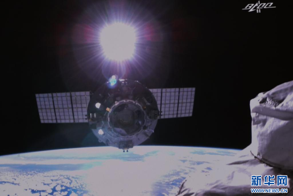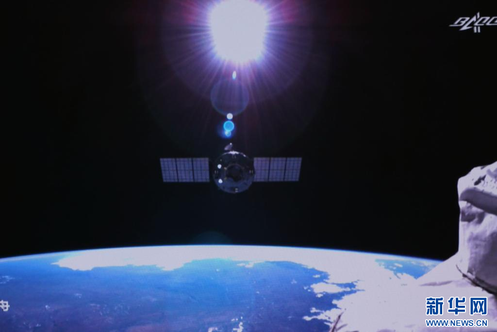 3月27日在北京航天飞行控制中心拍摄的天舟二号货运飞船撤离空间站核心舱组合体图像。这是天和核心舱外景相机实时图像。