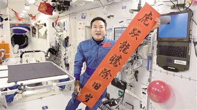 1月31日,农历除夕,神舟十三号航天员发来视频,向祖国和人民送上祝福。指令长翟志刚拿着对联说:“祝大家新春快乐,身体健康,万事如意。”