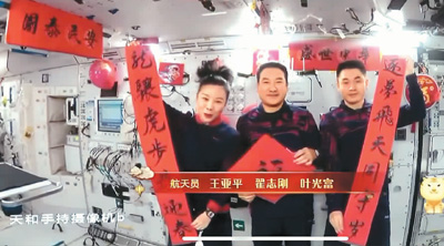 虎年春节到来之际,“神十三”飞行乘组在中国空间站天和核心舱通过中央电视台向全球中华儿女拜年。