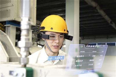 图为工作人员佩戴亮风台AR眼镜检修设备