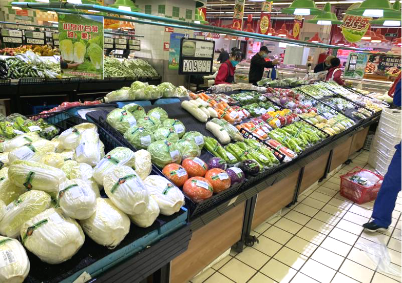 仅一下午时间,西红柿、卷心菜、大白菜等30吨蔬菜,13.4吨肉品,4吨鸡蛋就已运抵北京大润发各门店。店员随时补充货架,以便市民们挑选新鲜的瓜果蔬菜。