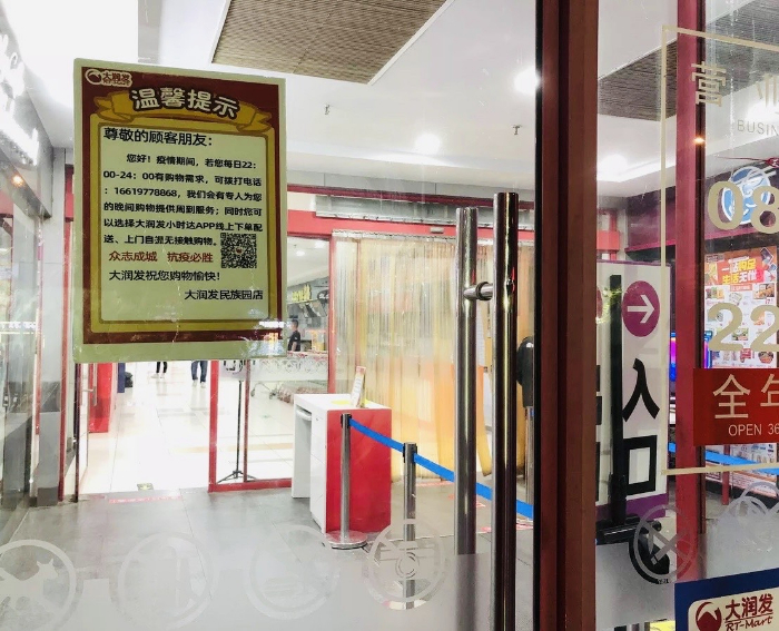 此外,北京大润发四家门店正常运营,营业服务至最后一位顾客离店。为满足打烊后部分顾客的需求,大润发还启用晚间特殊购物通道,22:00至24:00可拨打电话,会有专人提供晚间购物服务。