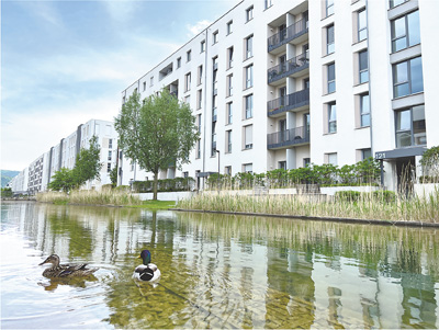 “这里的居住体验真的太棒了。楼下是绿地和水源,房间里非常舒适,能源消耗也比普通住宅要低得多,可以省下一大笔钱。”居民伍特勒和儿子在楼下的人工溪边玩遥控船,不远处,两只野鸭正在悠闲地凫水。