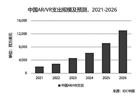 IDC近日发布了2022年V1版IDC《全球增强与虚拟现实支出指南》。根据IDC 最新发布的数据,2021年全球AR/VR总投资规模接近146.7亿美元,并有望在2026年增至747.3亿美元,复合增长率(CAGR)将达38.5%。其中,中国市场CAGR预计达43.8%,增速位列全球第一。