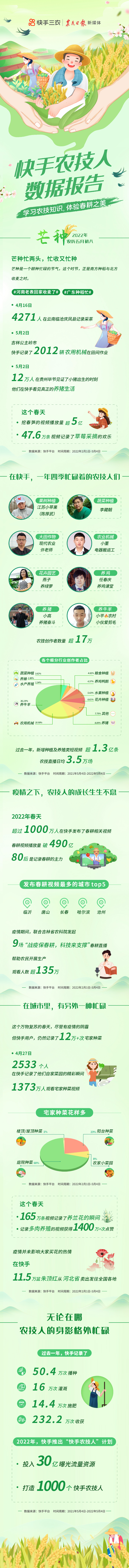 据了解,快手三农垂类推出2022“快手农技人计划”,从5月30日-12月31日, 对农业相关科普知识教学类优质内容进行流量扶持,将投入30亿流量资源,打造1000个快手农技人。