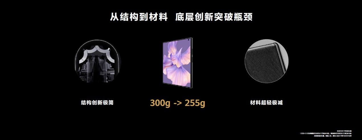 华为Mate Xs 2的研发团队从强度和密度两个维度出发,从理论上对各种材料进行组合研究,寻遍了几乎所有的材料,依然没有找到符合研发团队的要求的材料。之后,研发团队便将研究方向聚焦到材料的空心化技术上。受到鸟类骨骼结构的启发,研发团队向大自然学习,在玻璃纤维材质的电池盖上首创超轻中空微珠工艺,上下两层采用超轻玻璃纤维,中间一层采用中空玻璃微珠,最终实现电池盖重量下降50%,真正做到了又轻又薄。