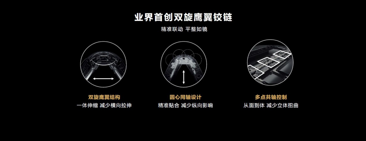 超平整屏幕的关键是屏幕和转轴的超精准联动,华为Mate Xs 2独创双旋鹰翼铰链,实现从屏幕到铰链的精准联动。双旋鹰翼结构,通过恒长控制,一体伸缩,减少对屏幕的横向拉伸;圆心同轴设计,精准贴合,减少纵向影响,实现铰链精准贴合屏幕;最后,通过多点共轴控制,降低段距带来的误差影响,减少立体扭曲,使得转轴和屏幕贴合更紧密。