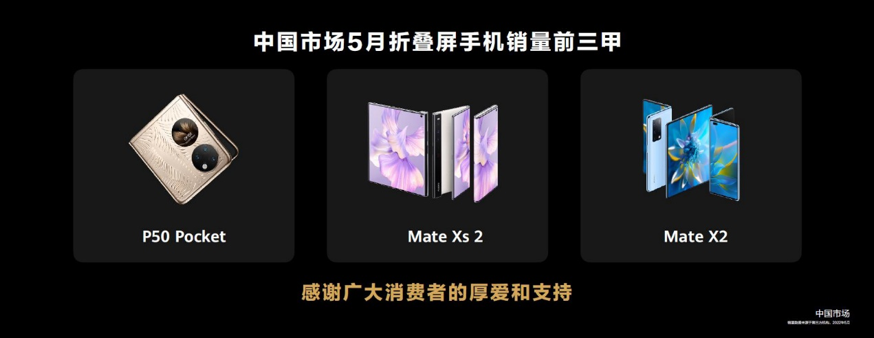 第三方数据显示,在刚刚过去的5月,中国市场折叠屏手机销量前三名均来自华为,包括华为Mate Xs 2、华为P50 Pocket和华为Mate X2。国内主流三方电商平台,华为Mate Xs 2消费者好评度稳居第一,深受广大消费者的喜爱。目前,三款华为折叠屏手机也在华为商城、各大授权电商及线下华为体验店、华为授权零售商火热销售中。