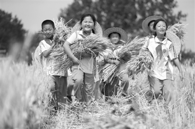 麦收时节,山东省青岛市即墨蓝谷高新区东皋埠小学学生们种植的小麦迎来丰收。孩子们在老师的指导下,收割小麦、捡拾麦穗、脱粒晾晒,在忙碌中感受劳动的艰辛和丰收的快乐。图为6月8日,青岛蓝谷高新区东皋埠小学的学生在麦田里搬运收获的小麦。