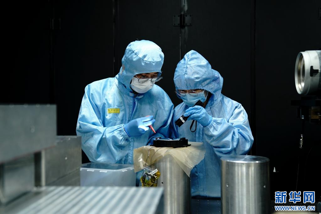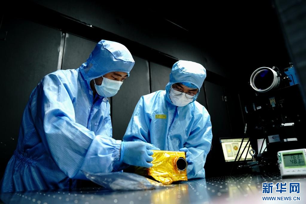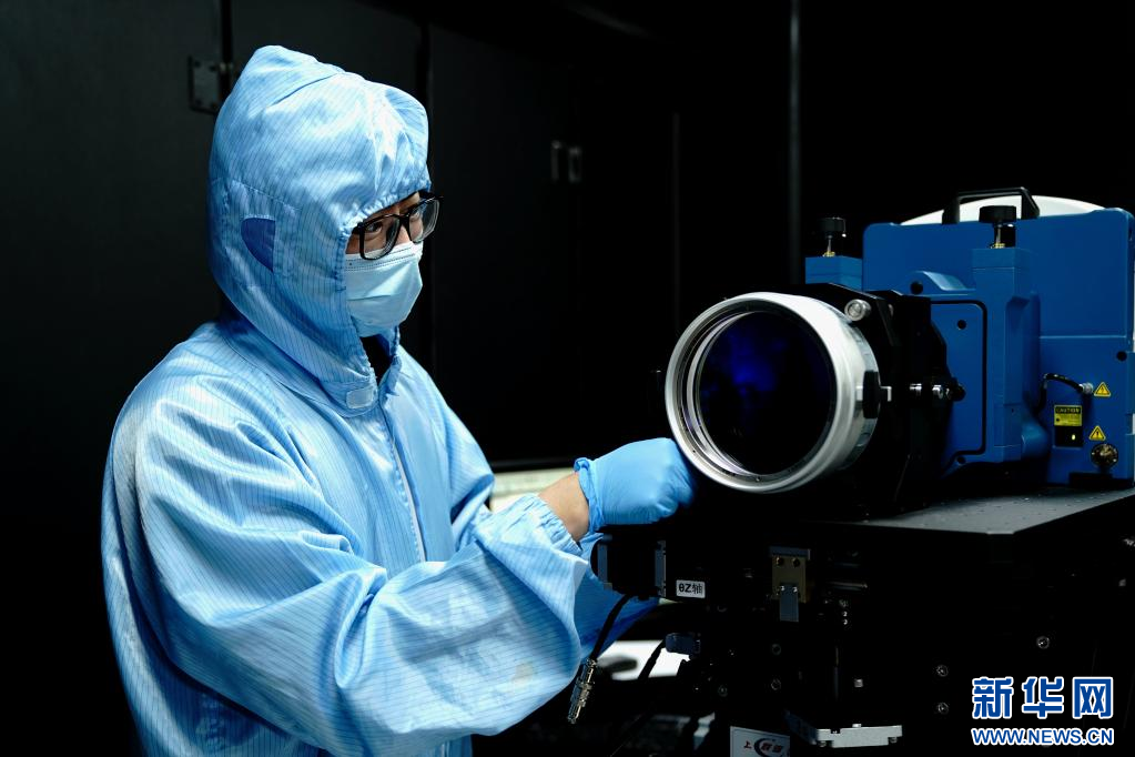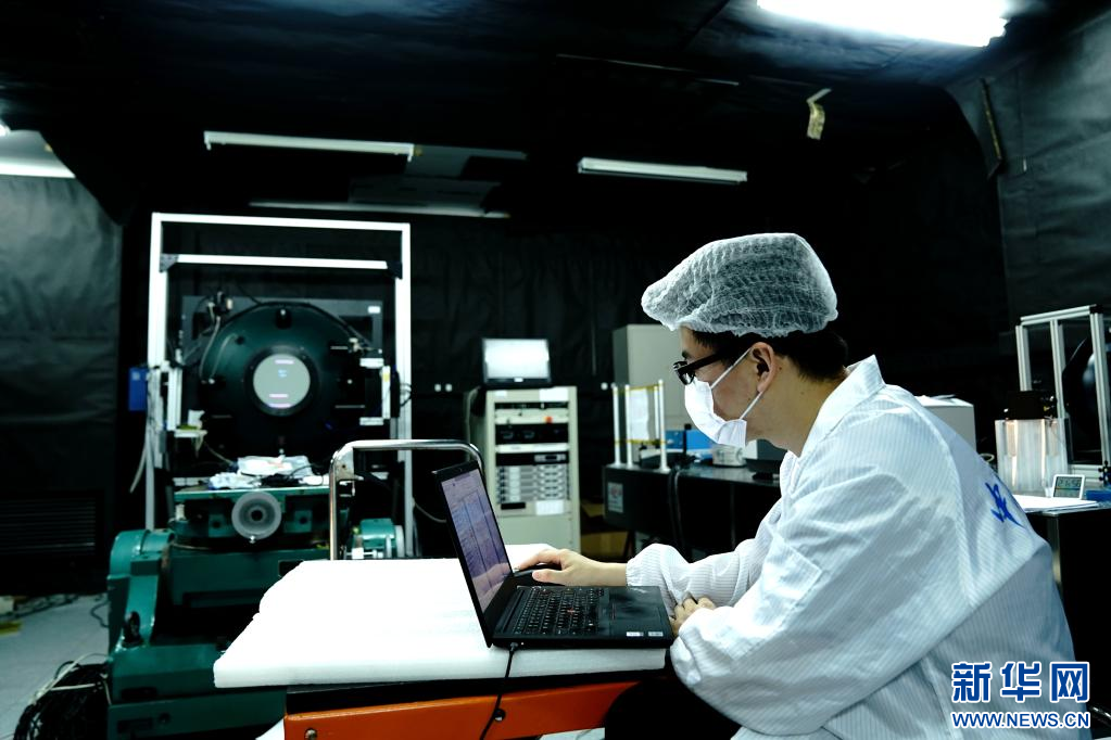 6月9日,中国科学院上海技术物理研究所科研人员在实验室检查航天产品光学镜面。