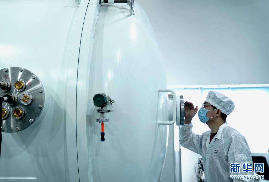6月9日,中国科学院上海技术物理研究所科研人员通过窗口观察航天产品试验状态。