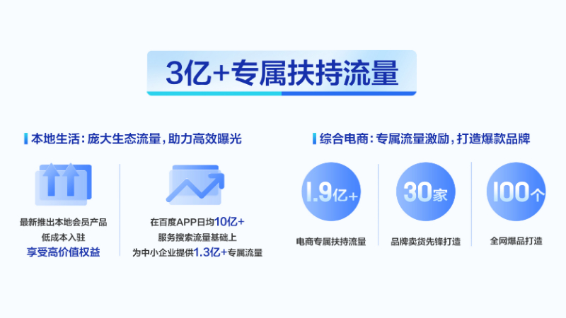 流量上,百度提供本地生活和综合电商专属扶持流量,并通过运营、激励等措施扶持品牌商家。