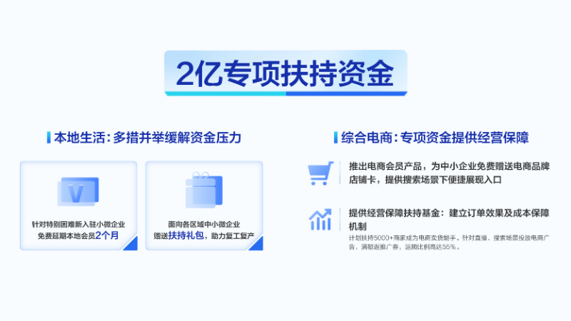 资金上,在本地生活领域,百度为中小企业赠送复工复产扶持礼包和本地会员;在综合电商领域,为会员赠送电商品牌店铺卡,建立订单效果和成本保障机制。