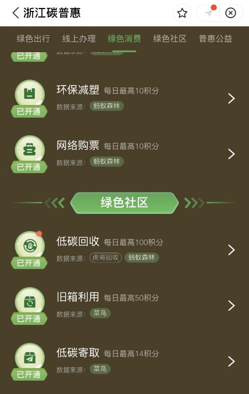 菜鸟接入浙江碳普惠平台以后,快递消费者参与菜鸟快递包装回收、低碳寄取、旧箱再利用,都可以在浙江碳普惠平台形成碳积分,获得上述权益。