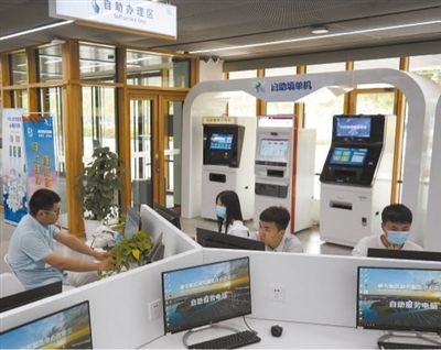 在河北雄安新区政务服务中心自助办理区,居民使用自助服务电脑办理业务。