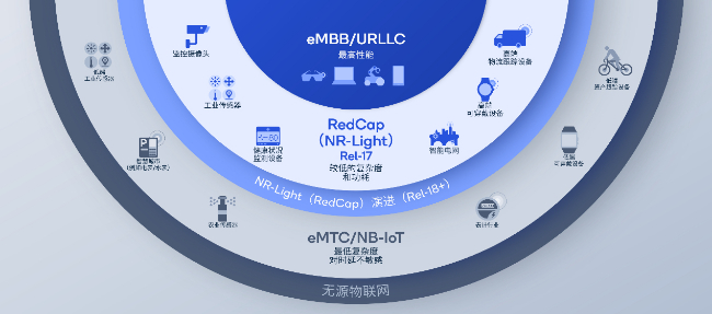 高通的5G愿景是一个持续演进以连接人与万物的创新平台。3GPP Release 17继续引入新能力,以优化向全新终端、服务和部署的扩展。为了高效地支持低复杂度5G终端,5G NR宽带设计可以简化至5G NR-Light,分别支持sub-7 GHz频段的20 MHz带宽和毫米波频段的100 MHz带宽。5G NR-Light可以支持更多用以降低复杂度的特性(比如单收和半双工)以及节能技术(包括更低的发射功率和增强的节能模式)。它们使得高效地支持低复杂度终端成为现实,比如可穿戴设备、工业传感器和监控摄像头。5G NR-Light在5G-Advanced(Release 18及其之后版本)中持续演进,可进一步降低设备复杂性,来广泛地支持物联网(IoT),缩小Release 17中5G NR-Light和eMTC(增强型机器类型通信)/NB-IoT(窄带物联网)之间的差距。