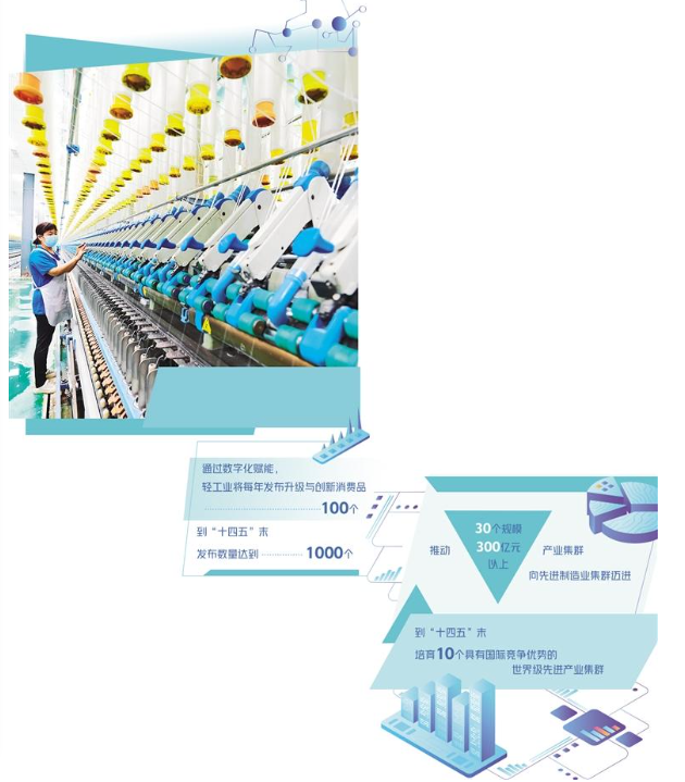 “轻工业将通过数字化赋能增品种、提品质、创品牌。”张崇和透露,将大力发展功能食品、婴童用品、智能家电、智慧家居、适老产品、绿色设计产品。每年发布升级与创新消费品100个,到“十四五”末,发布数量达到1000个。绿色设计产品总量达到2000个。同时,以数字化赋能产业集群转型,推动30个规模300亿元以上的产业集群率先向先进制造业集群迈进,形成超2万亿元规模的产业集群第一方阵。到“十四五”末,培育10个具有国际竞争优势的世界级先进产业集群。