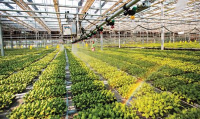 山东省东营市广饶县广饶街道乘南现代农业科技示范园投资建设物联网智能环境调控系统,实现物联网与数字技术的结合,实时远程监管控制。图为在乘南现代农业科技示范园的智能化育苗车间,工作人员对油菜苗进行喷淋管理。刘云杰摄(人民图片)