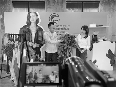 广州轻工工贸集团纺织品进出口公司员工在第131届广交会上进行直播。 新华社发(受访者供图)