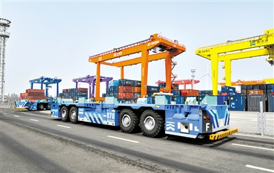 在天津港北疆港区C段智能化集装箱码头,智能水平运输机器人在堆场内行驶。新华社记者 孙凡越 摄