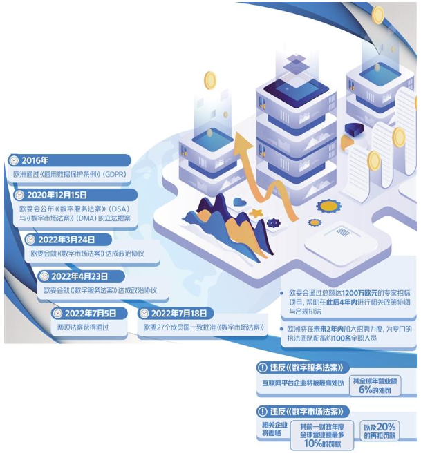 欧委会早在2020年12月15日就公布了这两项法案的立法提案。此后,欧洲议会分别于2022年3月24日、4月23日就《数字市场法案》和《数字服务法案》达成政治协议,进一步更新了相关法律问答文件,并最终于7月5日在欧洲议会以压倒性多数予以通过,这样的效率与结果对于以漫长拉锯著称的欧洲立法程序而言是少见的,也显示出欧洲对于整治域外数字巨头多年无序生长的决心。