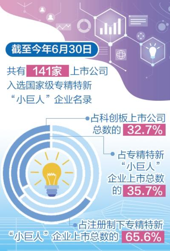 科创板作为科技创新型企业聚集地,截至今年6月30日共有141家上市公司入选国家级专精特新“小巨人”企业名单,分别占科创板上市公司总数的32.7%、专精特新“小巨人”企业上市总数的35.7%和注册制下专精特新“小巨人”企业上市总数的65.6%。专精特新企业加快突破“卡脖子”关键技术,有效连接产业链的“断点”、疏通“堵点”,为自主可控的国产化进程提速增效。