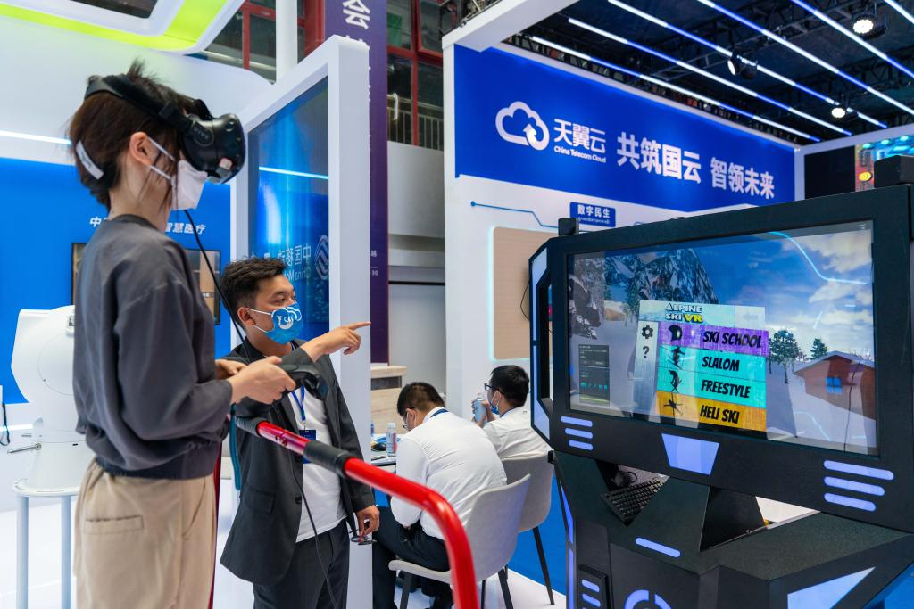7月28日,参观者在2022全球数字经济大会拉萨峰会上体验VR游戏。
