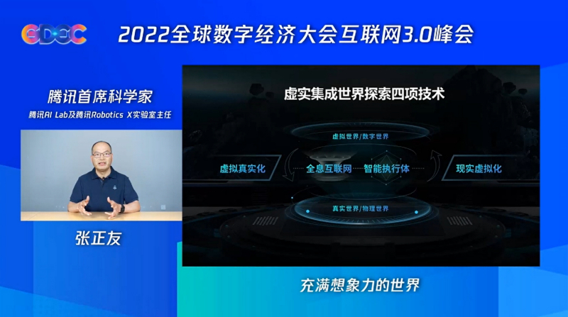 在28日举办的峰会上,腾讯首席科学家、腾讯AI Lab及腾讯Robotics X实验室主任张正友发表了题为《前沿技术打造虚实集成世界》的演讲。张正友认为,从技术角度来看,全真互联时代将迎来一个全新世界——一个虚拟世界和真实世界紧密结合的虚实集成世界(Integrated Physical-Digital World,IPhD)。