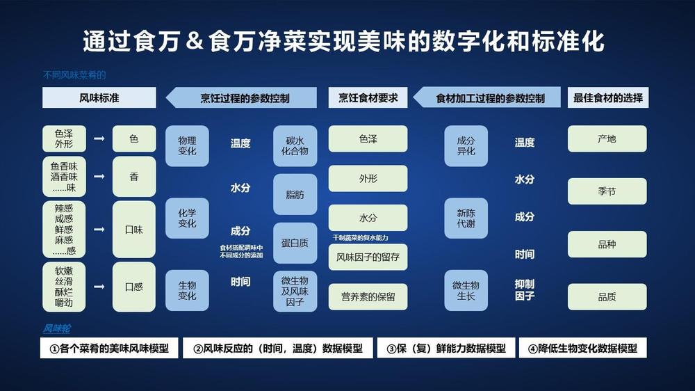 “食万模式”正是对决策层规划的积极实践。具体来看,风味标准环节要根据色、香、口味、口感确定菜肴美味风味模型;烹饪过程中根据美味要素、温度、水分、时间等参数建立风味反应数据模型;烹饪食材要求涉及色泽、外形、水分、风味因子及营养素留存等的保(复)鲜能力数据模型;在食材加工环节对温度、水分、成分、时间、微生物抑制因子进行参数控制,建立降低生物变化的数据模型;最后延伸到优质食材的选择,则要充分考虑产地、季节、品种、品质的影响。