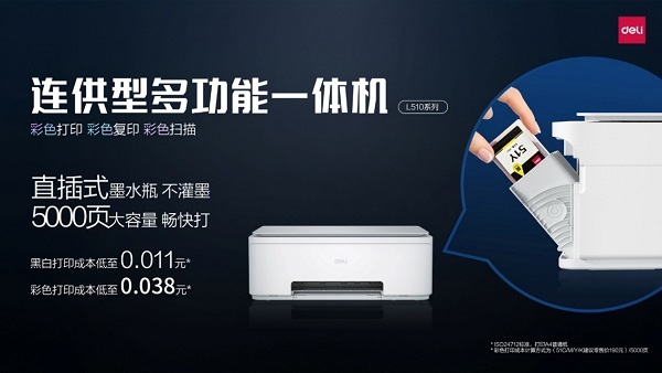 连供型多功能一体机L510系列,则采用5000页直插式大墨瓶,无需灌墨,不脏手,轻轻一插,即可开始打印,彩印单页仅需0.038元。