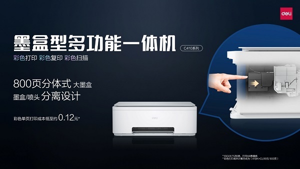 采用创新分体式墨盒设计的C410系列,换墨无需换喷头,800页大容量墨盒,彩打成本低至0.12元。