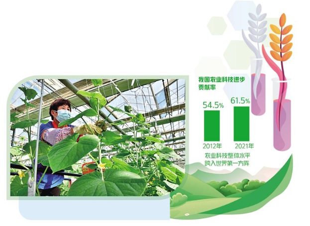 “近年来,我国农业科技创新成果不断取得突破,为保障国家粮食安全、促进农民增收发挥了重要作用。”农业农村部科技教育司司长周云龙说,农业科技进步贡献率从2012年的54.5%提高到2021年的61.5%,我国农业科技整体水平已从世界第二方阵跨入第一方阵。