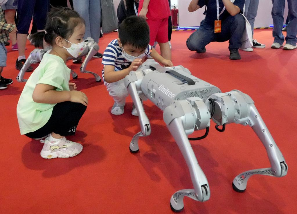 8月18日,两名小朋友在观看“机器狗”。