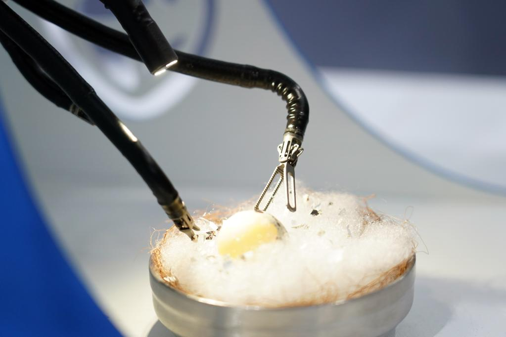 8月18日在2022世界机器人博览会现场拍摄的单孔腔镜手术机器人。
