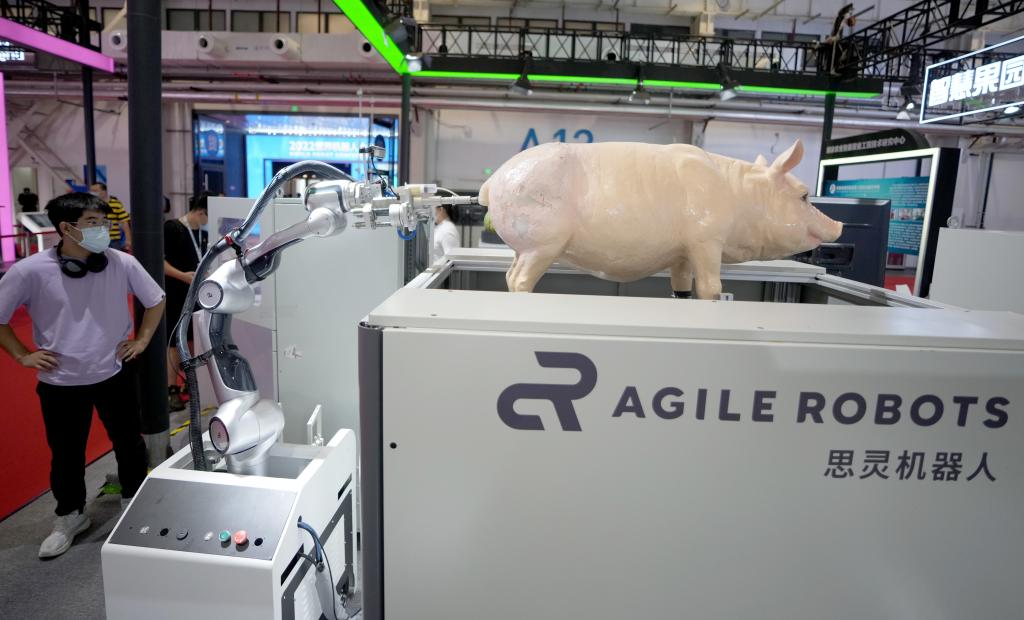8月18日在2022世界机器人大会上拍摄的可以给猪注射疫苗的机器人。