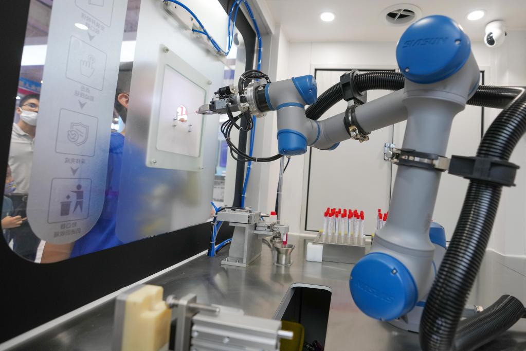 这是在2022世界机器人博览会上拍摄的一款使用机器人进行采样的便民核酸采样亭(8月18日摄)。