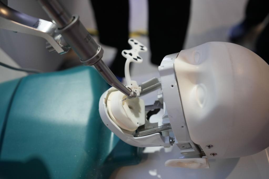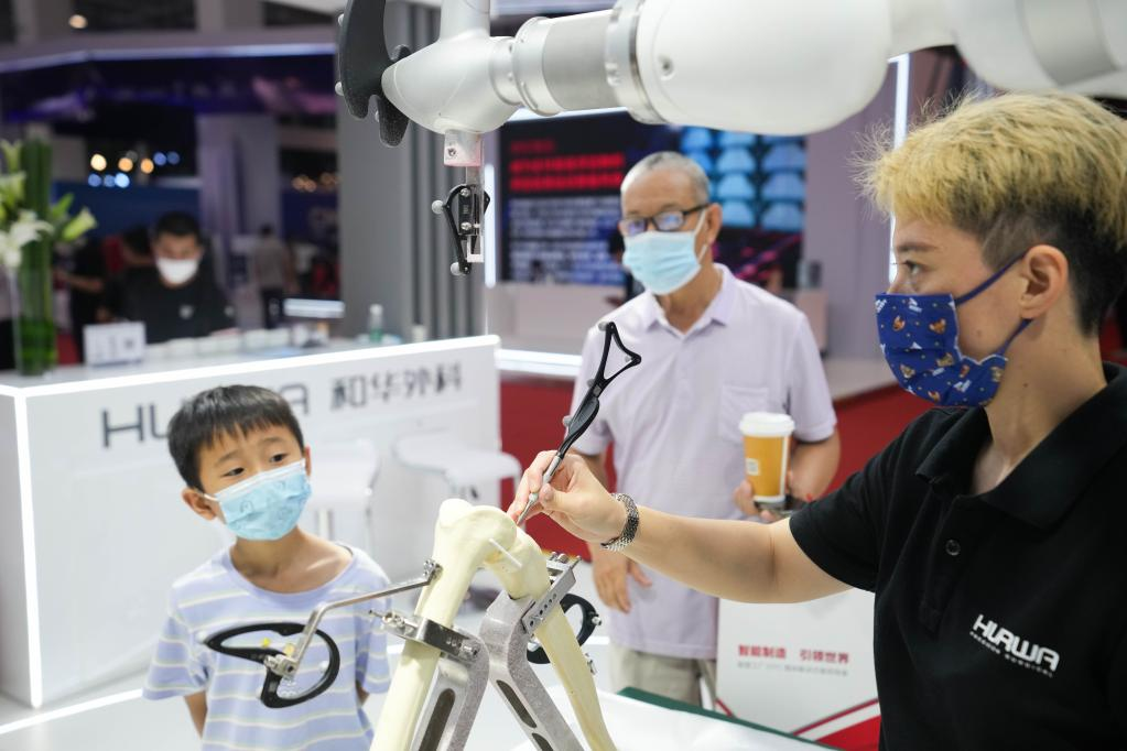 8月18日,工作人员在2022世界机器人博览会上演示一款骨科手术机器人。